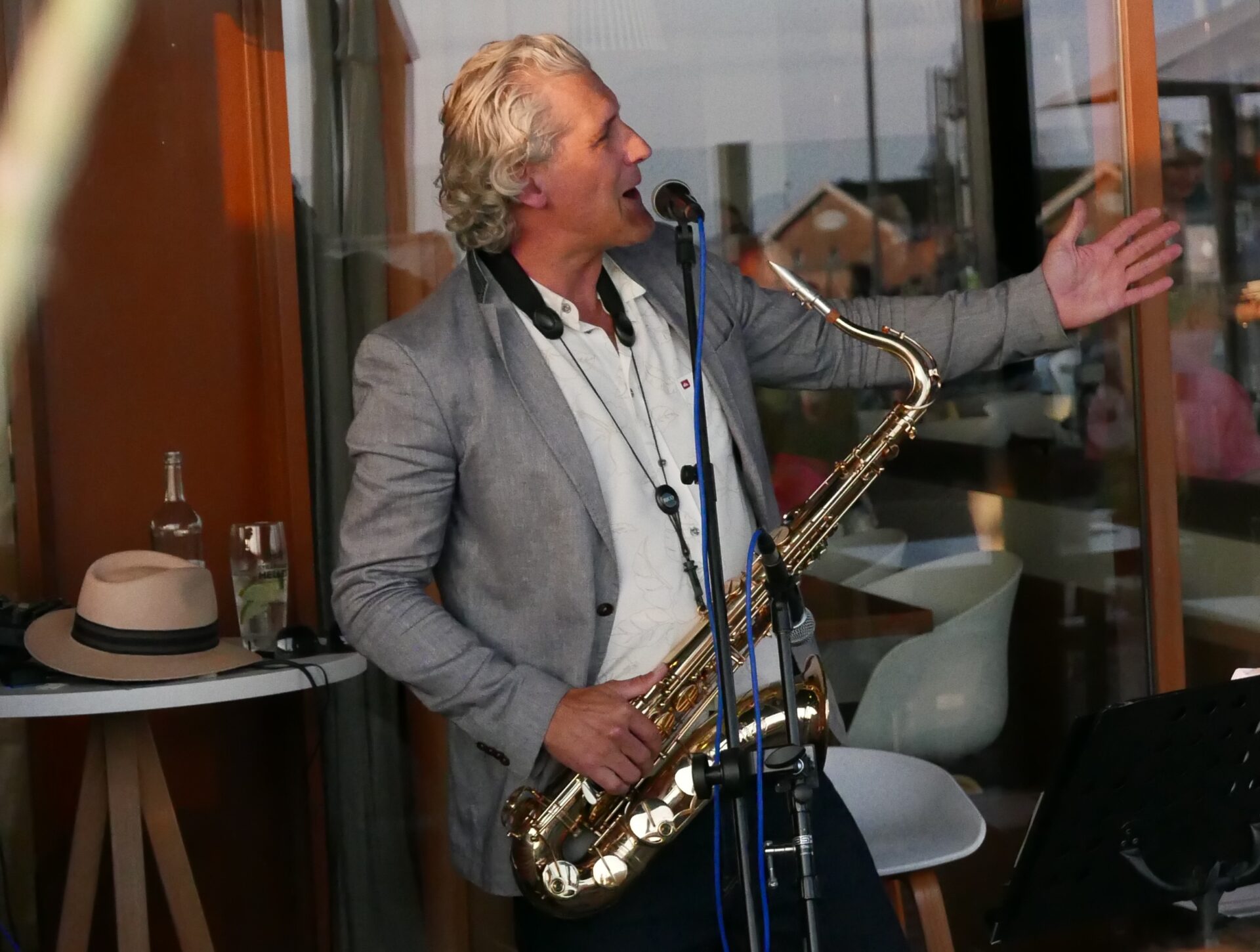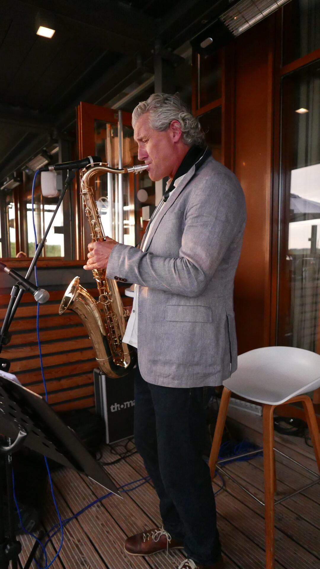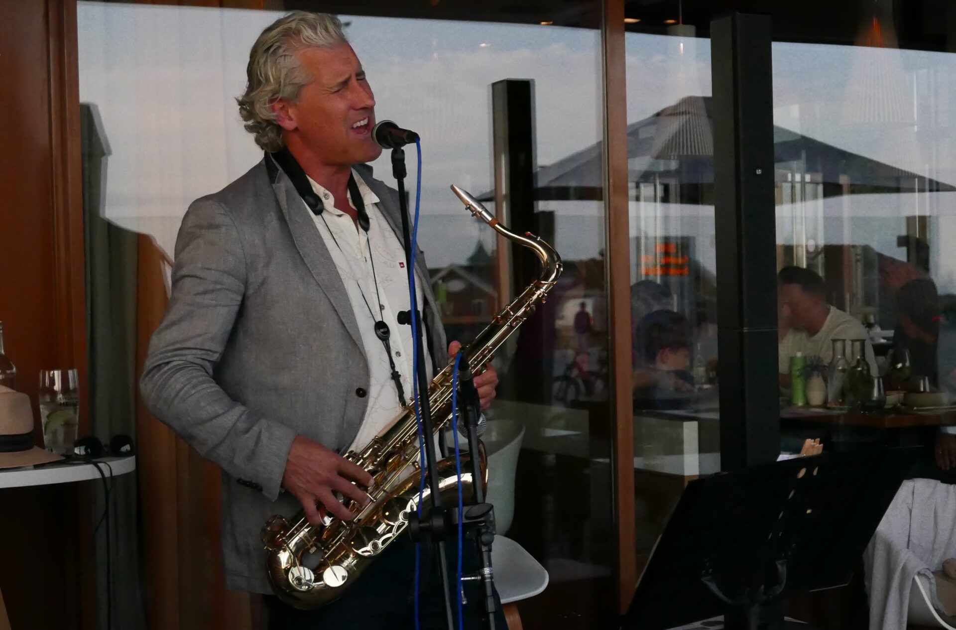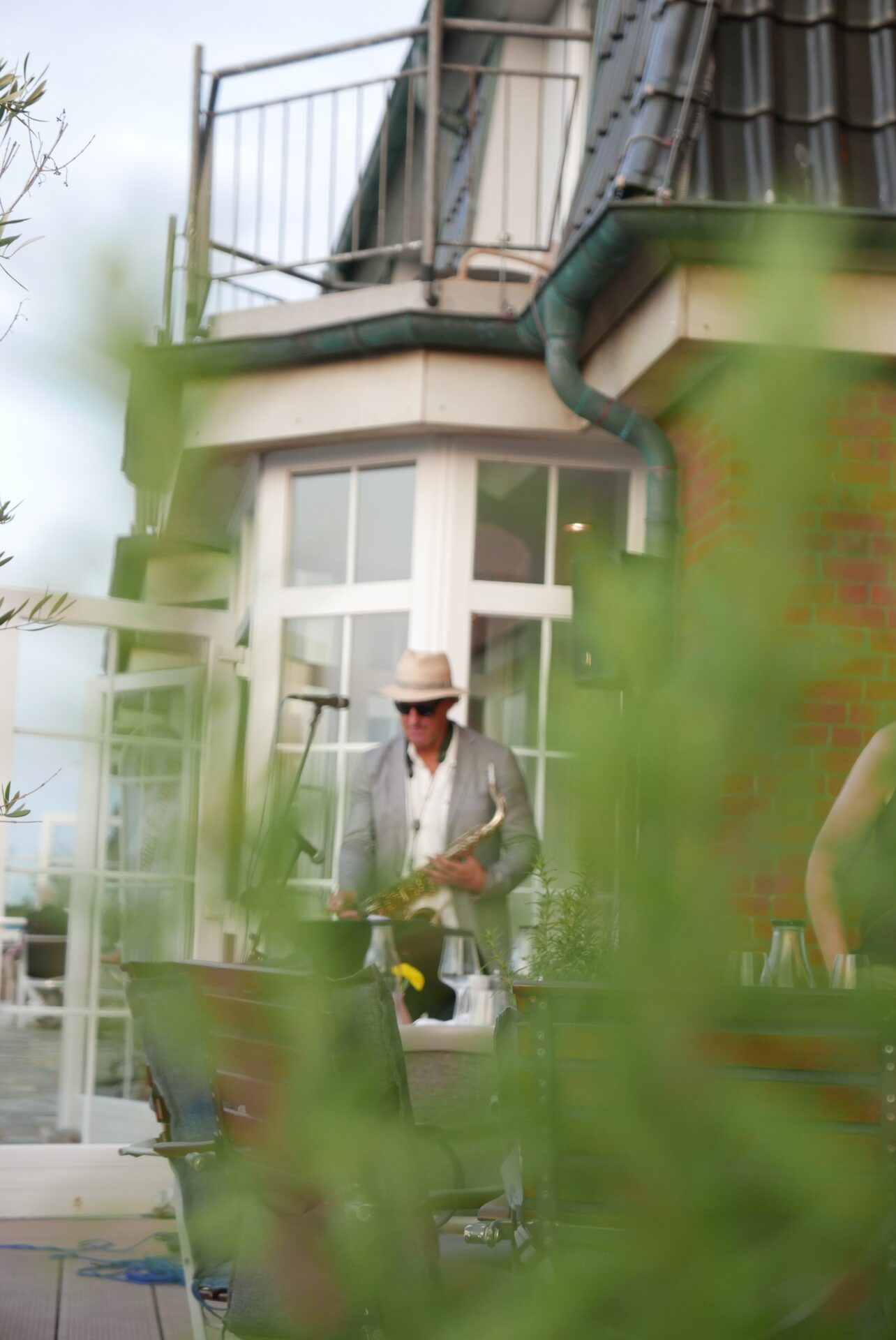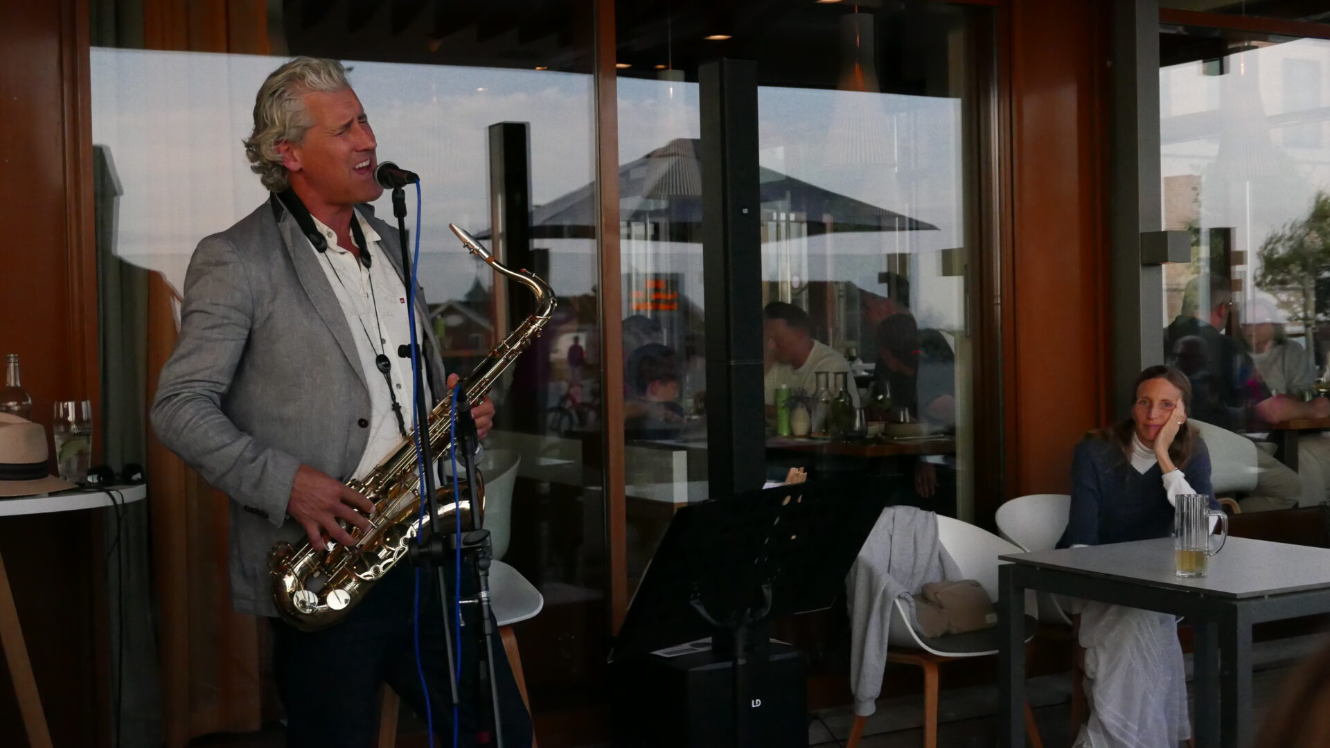 Im Hintergrund begleitet das feine Saxophonspiel von Saxophonist, Composer und Sänger Weert Kramer die Gäste mit anspruchsvollen Interpretationen verschiedenen Jazz- und Funk-Klassiker in den lauen Sommerabend.